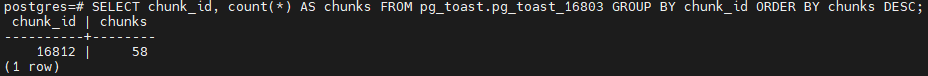 SELECT chunk_id, count(*) AS chunks FROM pg_toast.pg_toast_16803 GROUP BY chunk_id ORDER BY chunks DESC;