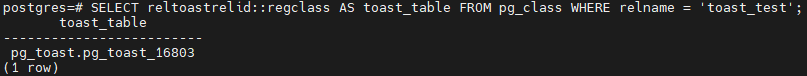 SELECT reltoastrelid::regclass AS toast_table FROM pg_class WHERE relname = 'toast_test';