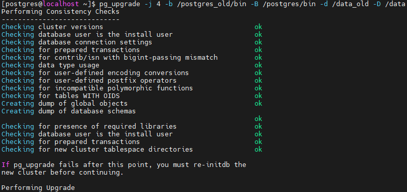 - pg_upgrade는 TO-BE 버전의 바이너리에서 수행해야 함.