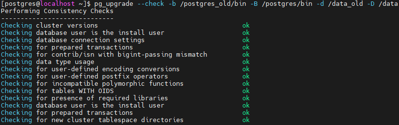 pg_upgrade --check -b <OLD_PGBIN> -B <NEW_PGBIN> -d <OLD_PGDATA> -D <NEW_PGBIN>