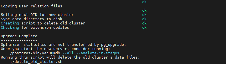 - OLD 클러스터 삭제 (pg_upgrade를 수행한 경로에 delete_old_cluster.sh이 생성되어 있음).