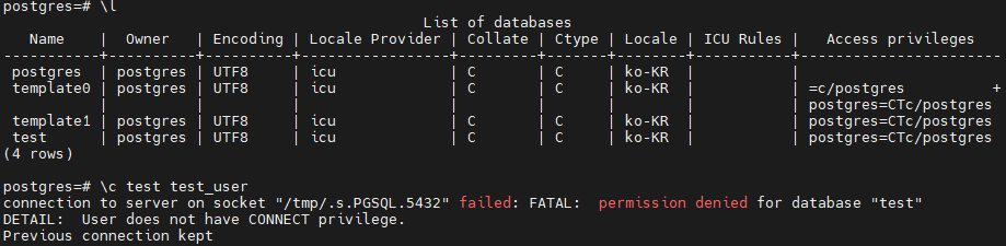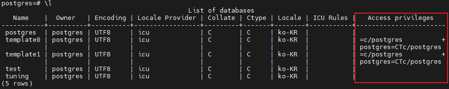질문에 대한 대답은 "\l에서 보이는 Access privileges는 데이터베이스 레벨에서 설정된 접근 권한을 의미합니다."입니다.