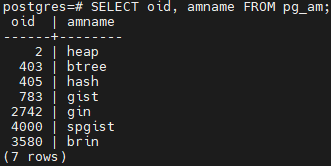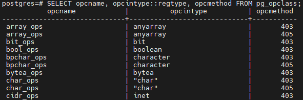 - pg_opclass와 pg_am을 통해 메타데이터 확인 가능