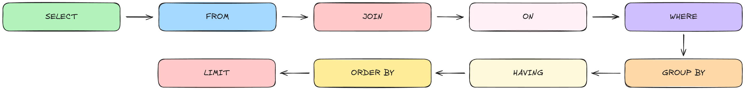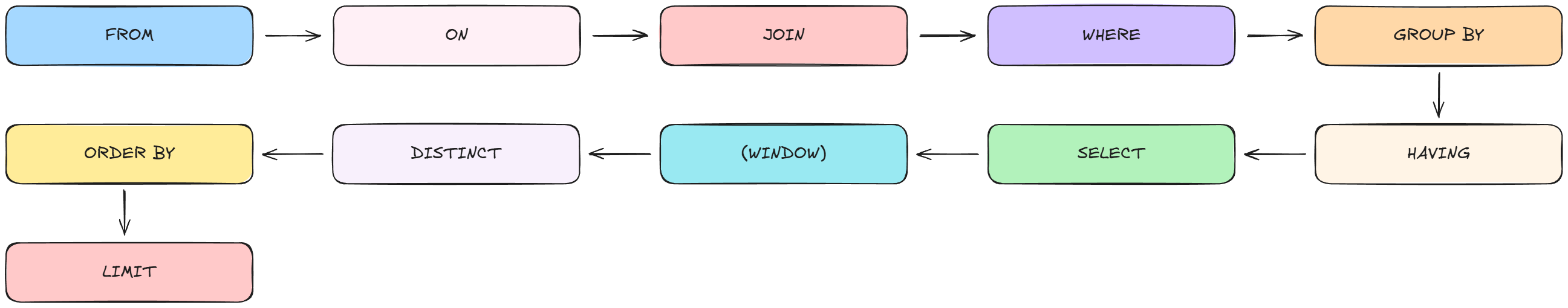 FROM → ON → JOIN → WHERE → GROUP BY → HAVING → SELECT → (WINDOW) → DISTINCT → ORDER BY → LIMIT