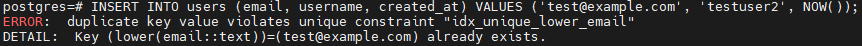 → 두 번째 INSERT 시, lower('Test@Example.com')와 lower('test@example.com') 모두 'test@example.com'으로 평가되므로, 인덱스의 유일성 제약에 의해 중복 키 에러(duplicate key error)가 발생하게 됩니다.