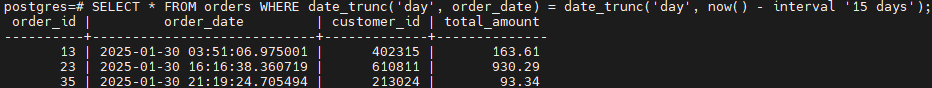 Filter: (date_trunc('day'::text, order_date) = date_trunc('day'::text, (now() - '15 days'::interval)))