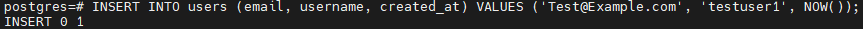 INSERT INTO users (email, username, created_at) VALUES ('test@example.com', 'testuser2', NOW());