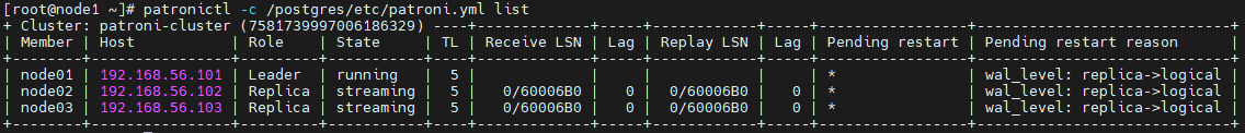 patronictl -c /postgres/etc/patroni.yml edit-config patroni-cluster --pg wal_level='logical' --force